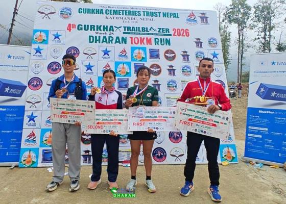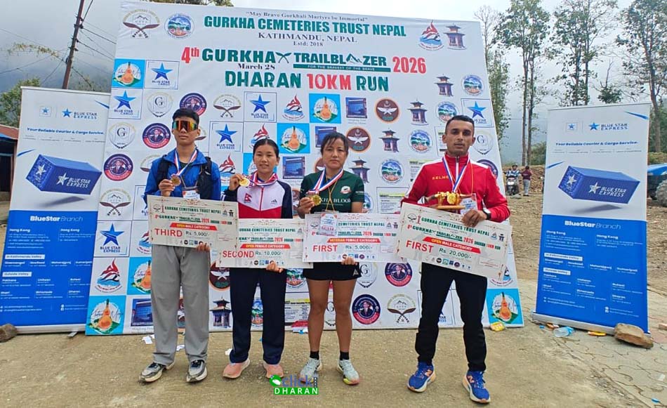 धरान: वीर गोर्खालीहरुको सम्मान तथा सम्झनामा आयोजित चौथो गोर्खा ट्रेलब्लेजरमा पुरुषतर्फ उमेश थापा र महिलातर्फ प्रिया तामाङ प्रथम भएका छन् । पुर्खा दिवसको अवसरमा शनिबार धरानमा सम्पन्न दौड प्रतियोगितामा पुरुषतर्फका विजेता थापाले ८ किलोमिटरको निर्धा ...